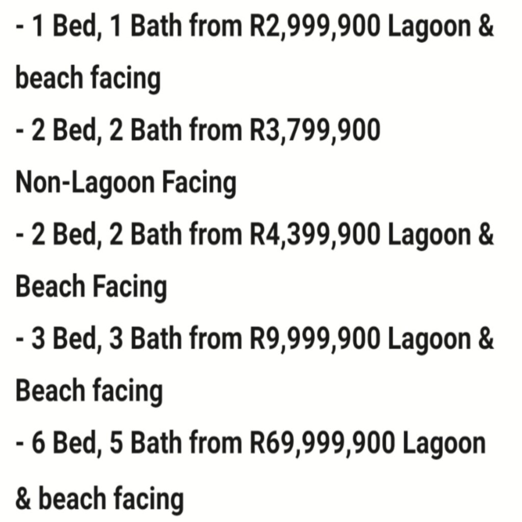 Pricing for apartments around the lagoon starts at R3 million and can go to as much as R70 million.