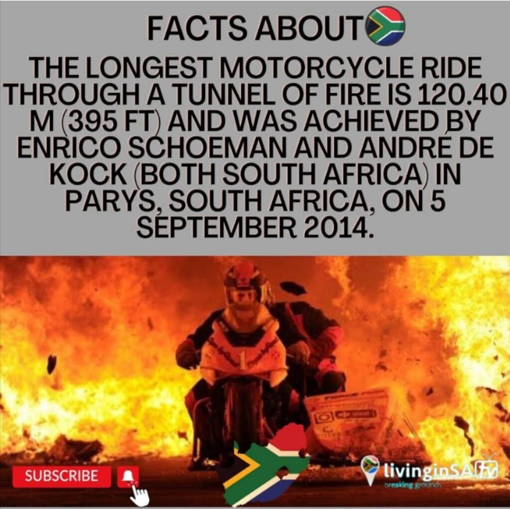 Facts The Longest Motorcycle Ride Through A Tunnel April 23, 20231 min read The longest motorcycle ride through a tunnel of fire is 120.40 m and was achieved by Enrico Schoeman and Andre de Kock in Parys, South Africa, on 5 September 2014. Share this post: on Twitter on Facebook