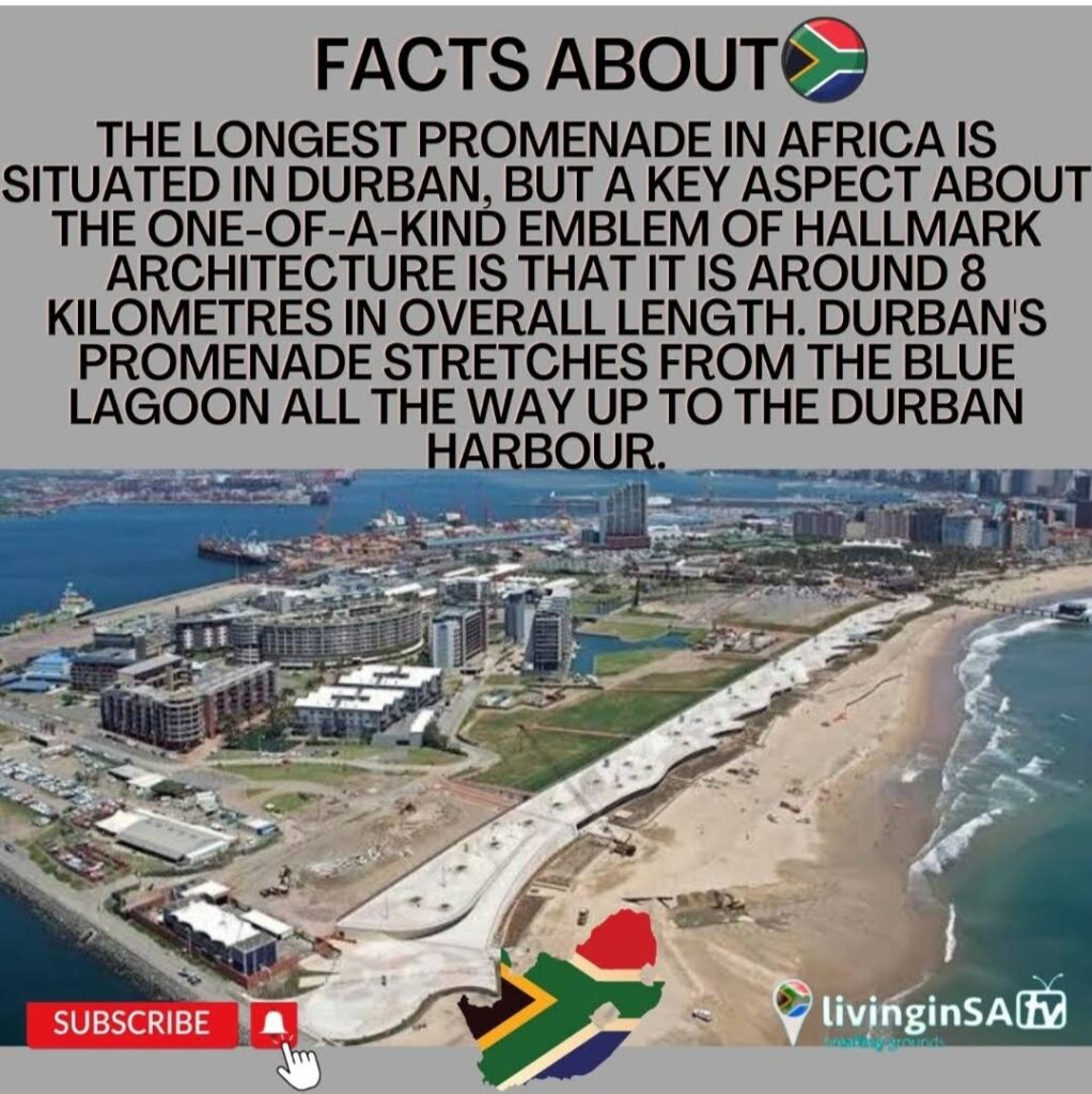 The longest promenade in Africa is situated in Durban, but a key aspect about the one-of-a-kind emblem of hallmark architecture, is that it is around 8 kilometres in overall length. Durban’s promenade stretches from the blue lagoon all the way up to the Durban harbour.