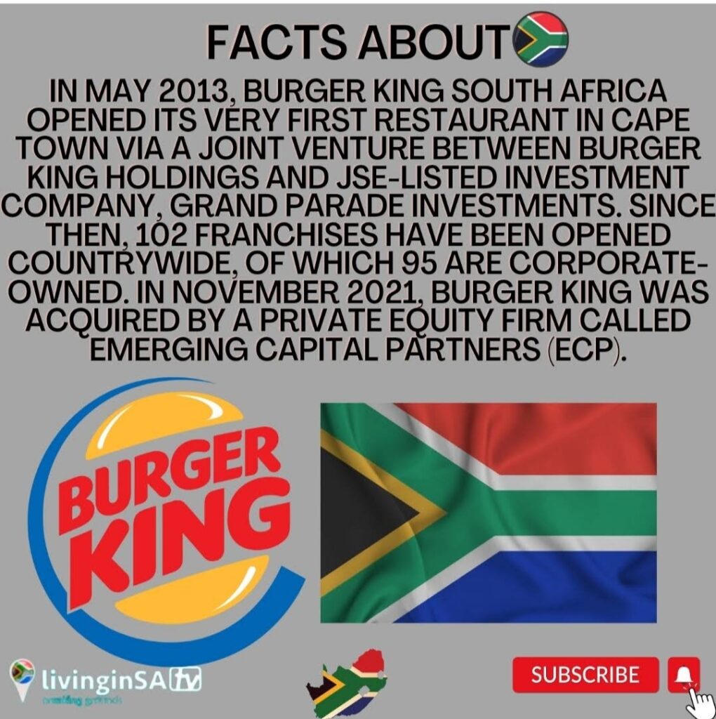 Since then, 102 franchises have been opened countrywide, of which 95 are corporate owned. In November 2021, Burger King South Africa by a private equity firm called Emerging Capital Partners.