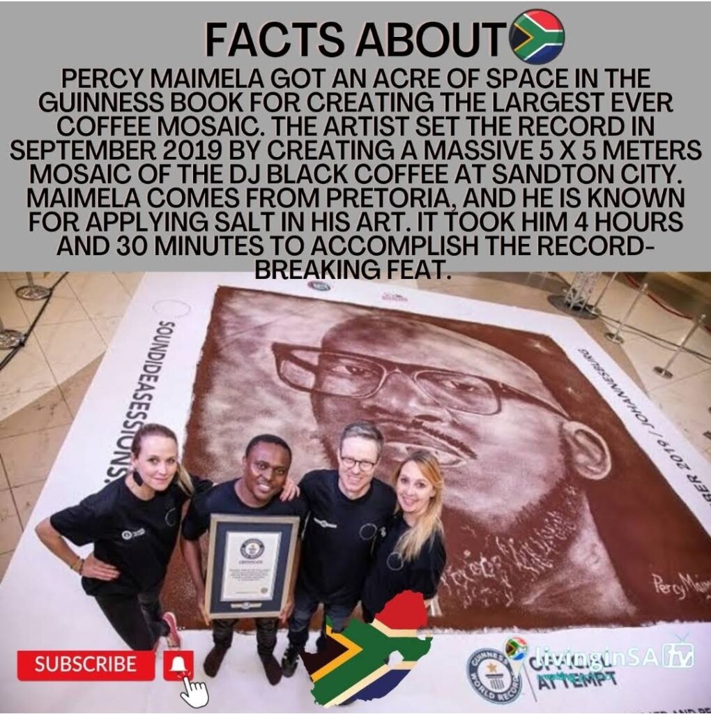 Percy Maimela got an acre of space in the Guinness book for creating the largest ever mosaic. The artist set the record in September 2019 by creating a massive 5 x 5 meters mosaic of the DJ Black Coffee at Sandton City.